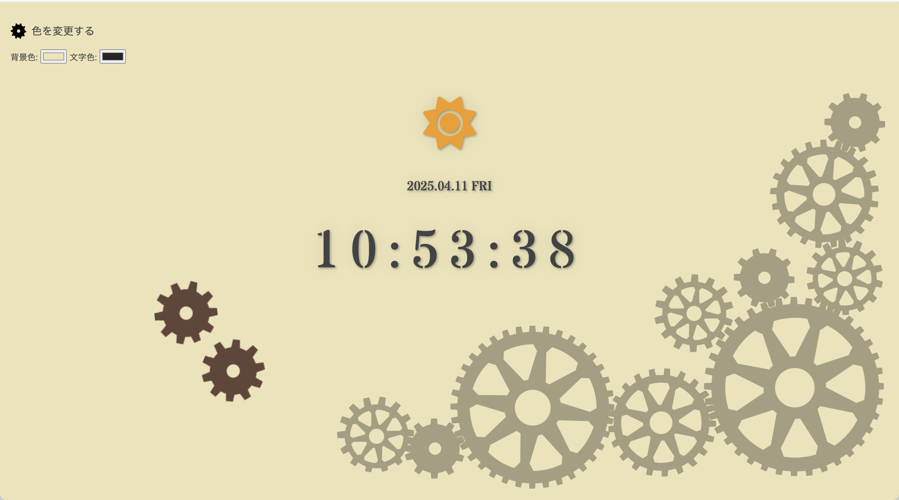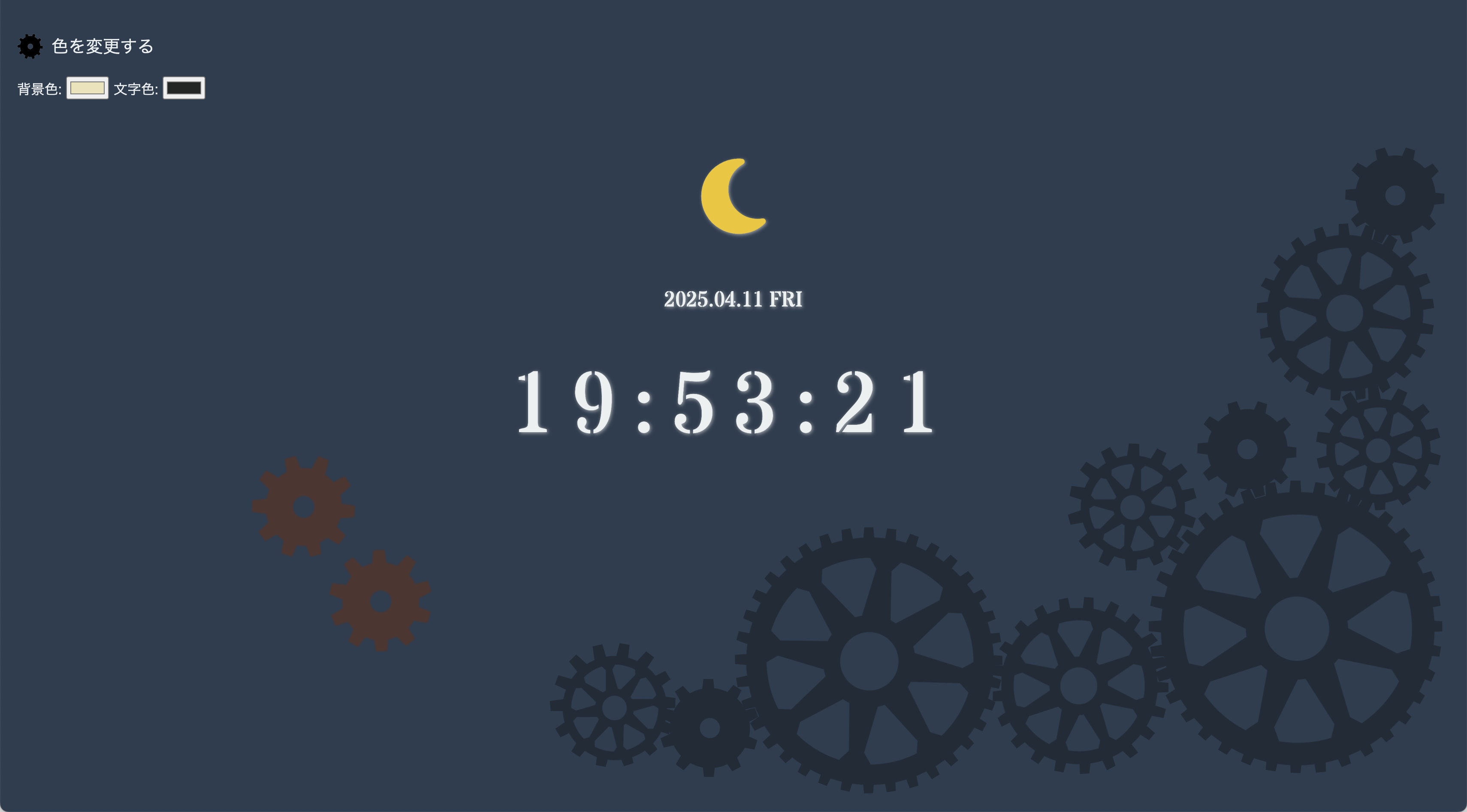 サイトを見てデジタル時計の実装をjsで行い、その後自分で自由に装飾や機能を追加するといった課題で、今回私は主な機能として時間帯で表示が変わる、色を自由に変更できる、というものを作りました。