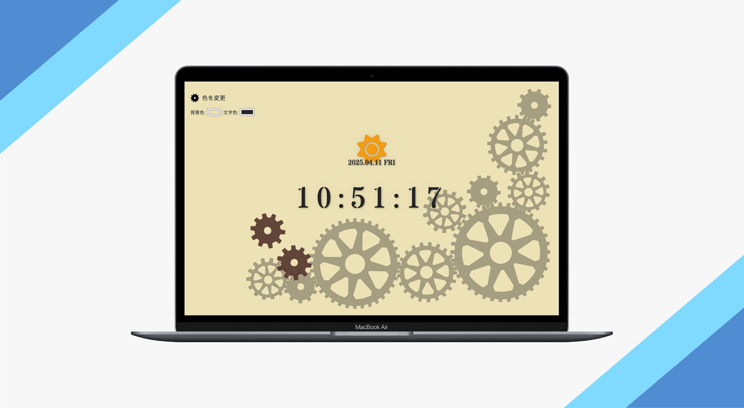デザインは、デジタル時計ということで歯車などのデザインが思いついたので、Illustratorでデザインを作り、回るアニメーションをつけました。