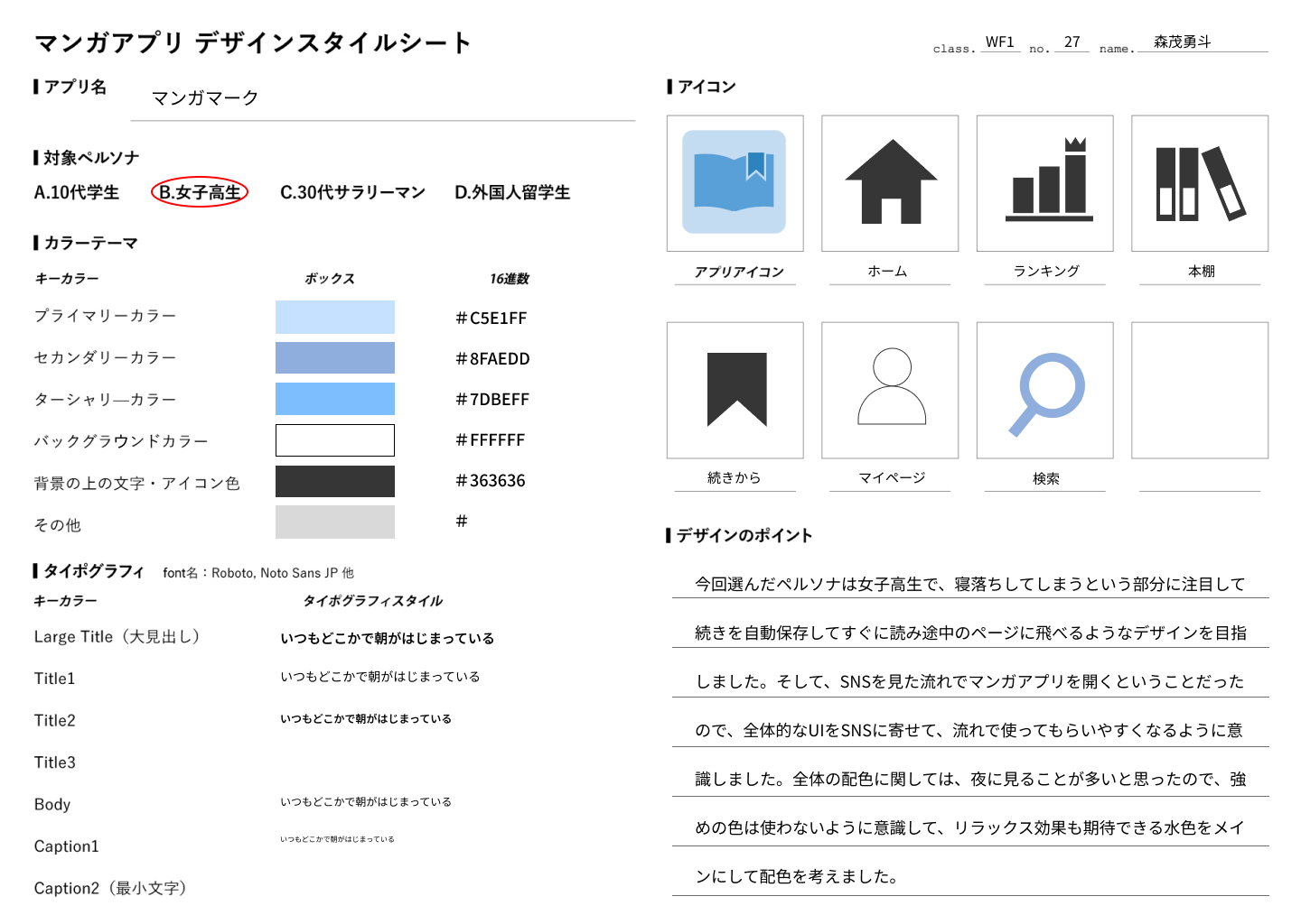ペルソナがいかに大切かを学べた制作だったと思います。現在、アプリ制作という授業があるのですが、そこでは実際にユーザーテストを行なったり、より本格的な制作を学んでいます。この時の経験が今の制作にしっかり活きていると思います。