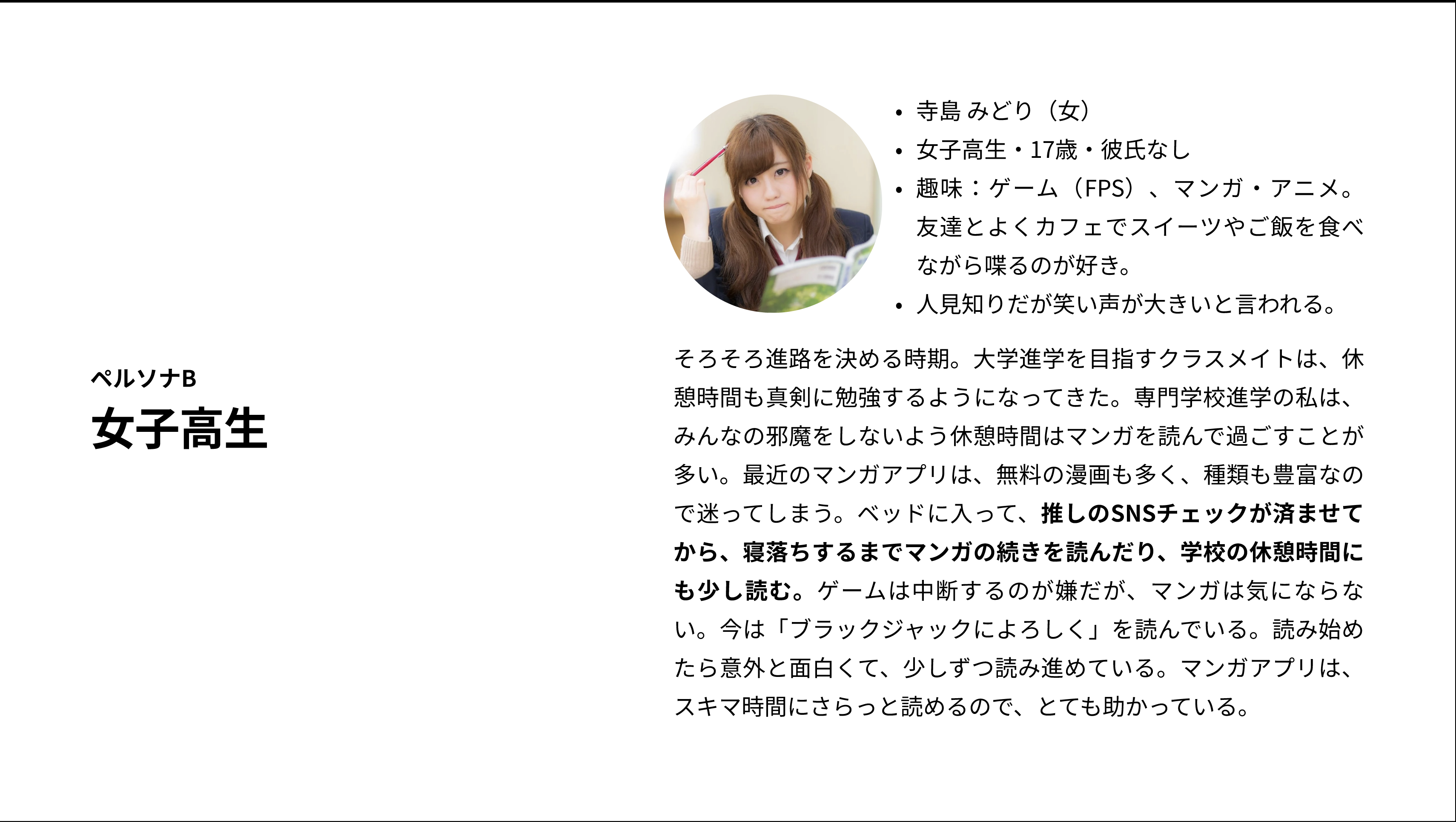 まず、用意された架空のペルソナの中から一人を選び、そのペルソナに向けてアプリを制作しました。